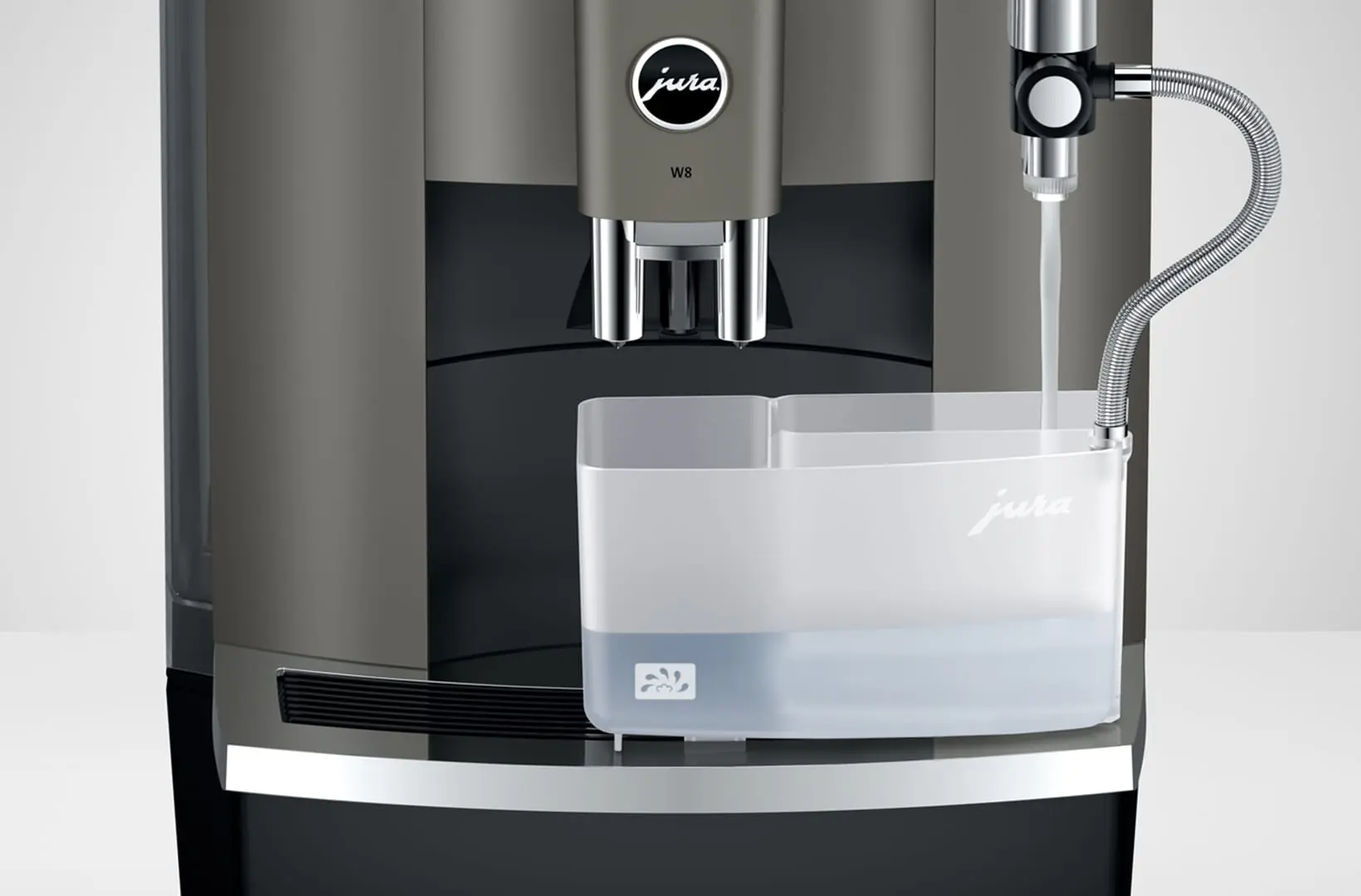 La JURA W8 est une machine à café professionnelle compacte conçue pour les environnements exigeants comme les bureaux, showrooms ou services clients. Avec sa largeur contenue (29,5 × 44,3 × 44,6 cm), elle s’intègre facilement tout en offrant des performances de haut niveau.