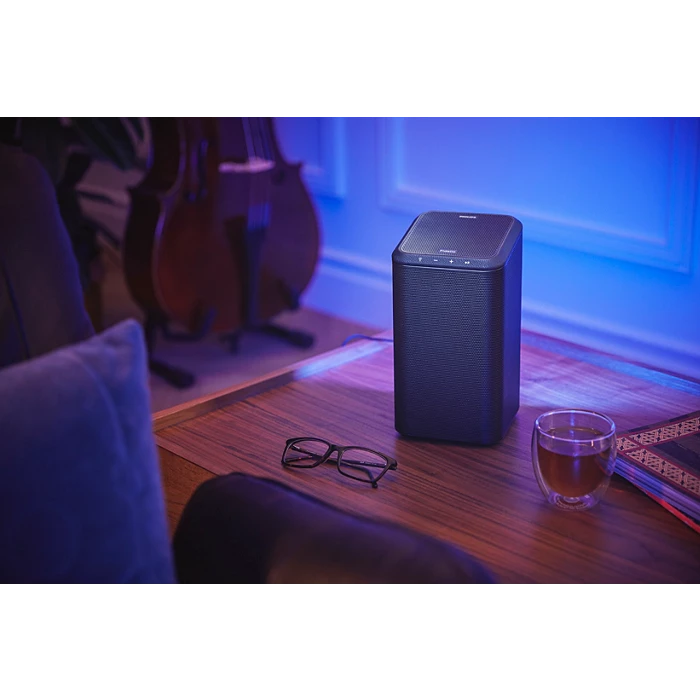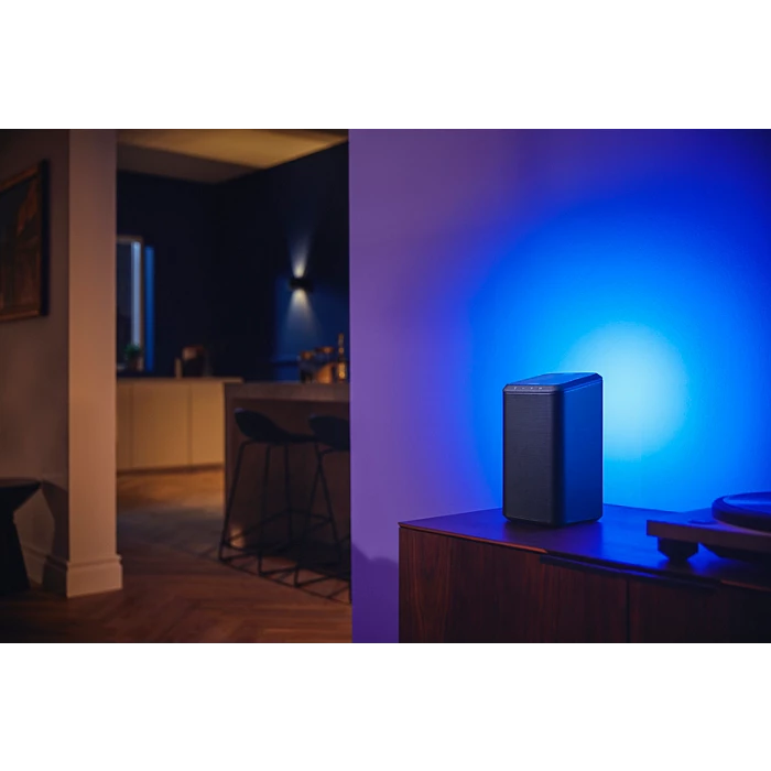 La Philips Fidelio FS1 (réf. TAFS1/10) est une enceinte sans fil premium qui offre un équilibre sonore exceptionnel : aigus clairs, médiums chaleureux et basses profondes grâce à son haut-parleur orienté vers le bas et ses deux membranes passives. Compatible WiFi double bande et Bluetooth 5.0, elle prend en charge les standards de streaming modernes (Chromecast, AirPlay 2, DTS Play-Fi). Idéale pour le multiroom, elle peut être utilisée seule ou associée à d’autres FS1 pour stéréo, à la barre de son Fidelio FB1 ou au caisson Fidelio FW1 pour un son Home Cinéma encore plus immersif. D’une puissance de 60 W RMS (120 W max), avec une réponse en fréquence de 50 Hz à 20 kHz, elle remplit parfaitement une pièce de taille moyenne. Design soigné avec grille métallique et finitions cuir Muirhead anthracite, elle s’intègre élégamment dans tous les intérieurs.